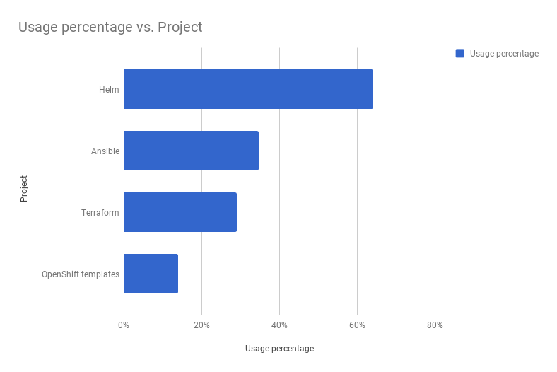 Only 4 tools were in use by more than 10% of those who took the survey with Helm being in use by 64% of them. Many more tools were used by more than 1% of people including those we directly asked about and the space for people to fill in those we didn't ask about. The long tail, captured in the survey, contained more than 80 tools in use.