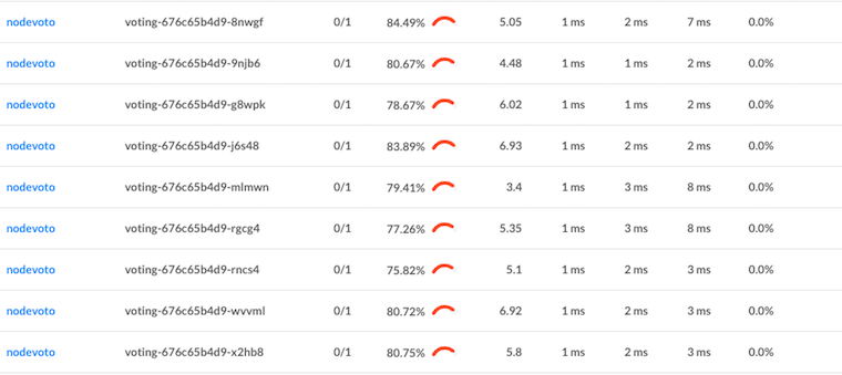 그림과 같이, 모든 파드에 대한 CPU 그래프가 활성화되어 모든 파드가 —코드를 변경하지 않았지만— 트래픽을 받고 있다. 짜잔, 마법처럼 gRPC 로드 밸런싱이 됐다!